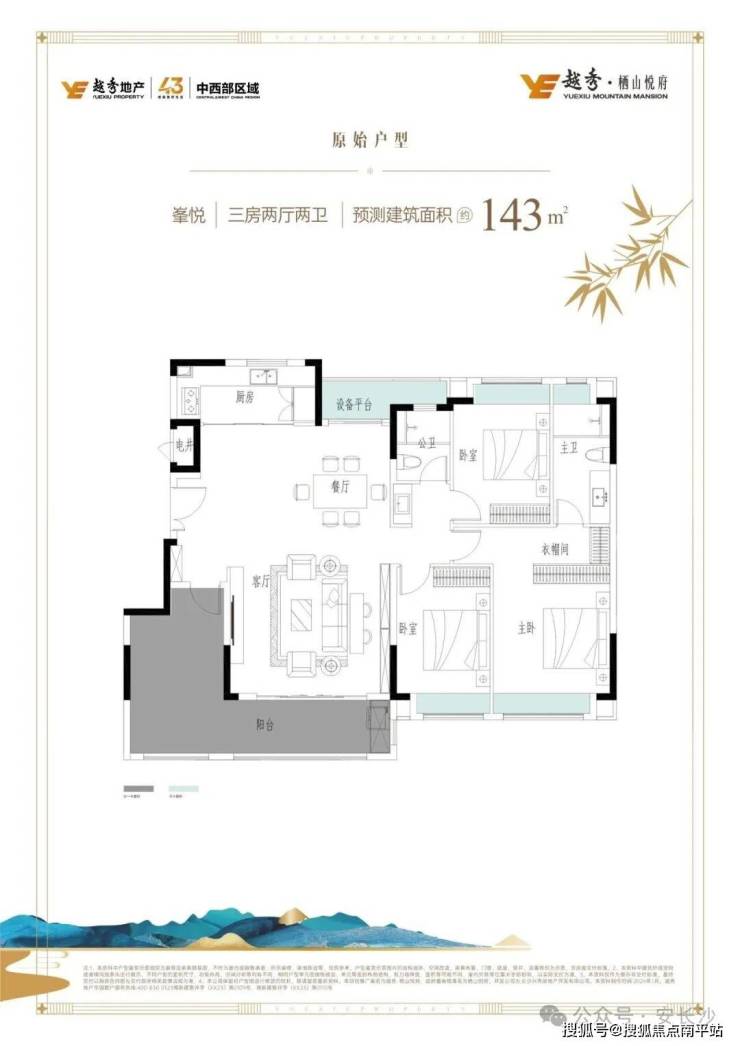 143㎡三房两厅两卫:开间约 5 米的大横厅,外接 8 米 L 型南向阳台,直看谷山山景。入户花园半赠送,客餐厅一体化,空间感拉满,三代同堂也不局促,改善一步到位;