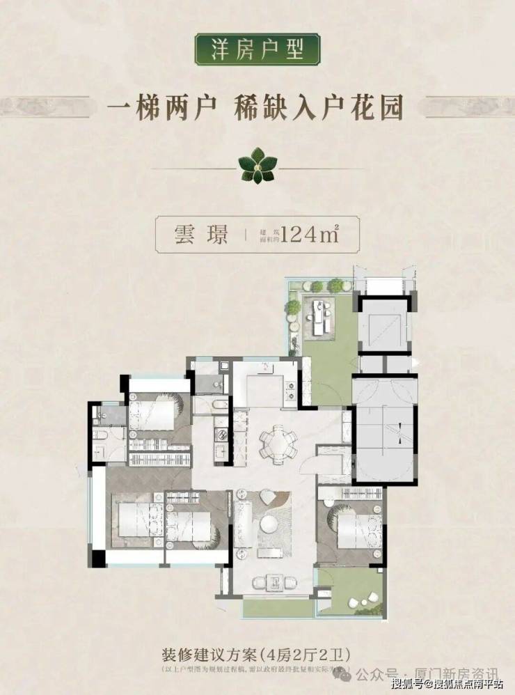 观雲 花园洋房建面约124㎡以一层两户的纯粹与舒适,有更便捷的归家体验。 约15平方米的私享入户花园,是孩子的自然课堂,也是您的茶歇花房; 约3.15米层高与全屋多飘窗设计,让家充满光与清风; 高达约101%的综合使用率,可以让每一寸空间都长成生活的样子。