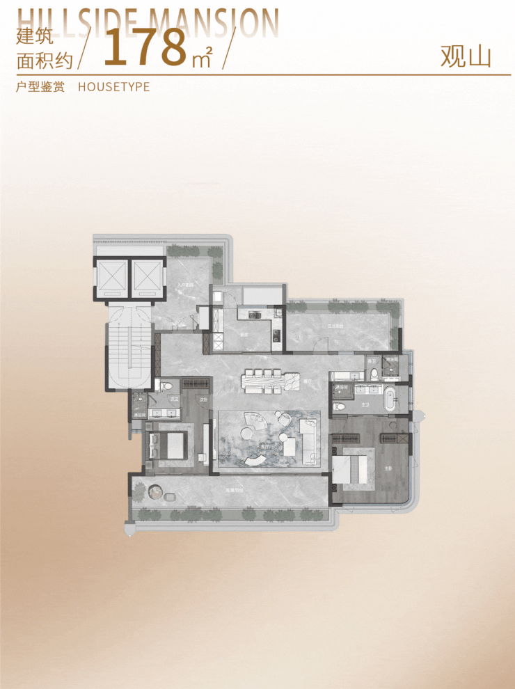 接下来,是全社区仅24席的178㎡超级度假大平层,楼栋踞守小区中轴,是真正意义上的楼王。