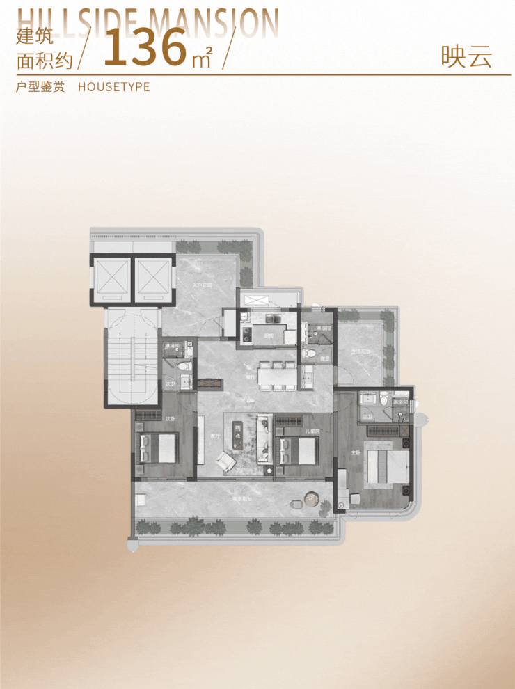 这一户型南北通透,四开间朝南,136㎡尺度做到了四房三卫,充分满足了三代同堂、二胎家庭的居住需求。