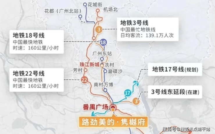 项目距离最近的地铁站3号线番禺广场站约800-900米左右,在这里有4条地铁交汇,分别为18-22-3号线,还有规划中的17号线,去珠江新城、琶洲都是直达过去。
