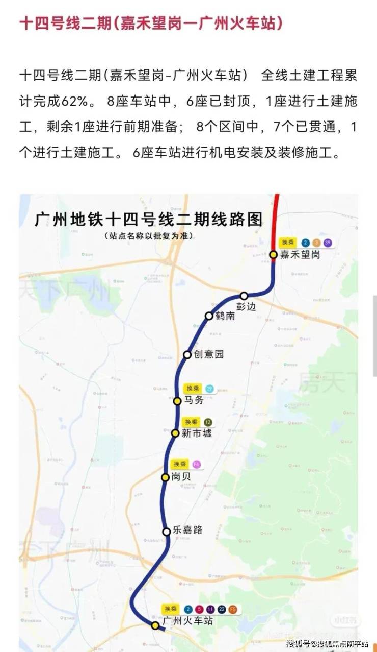目前14号线二期(嘉禾望岗-广州火车站)24年8月份土建工程进度62%,预计2025年建成(具体时间以官方公告为准)。