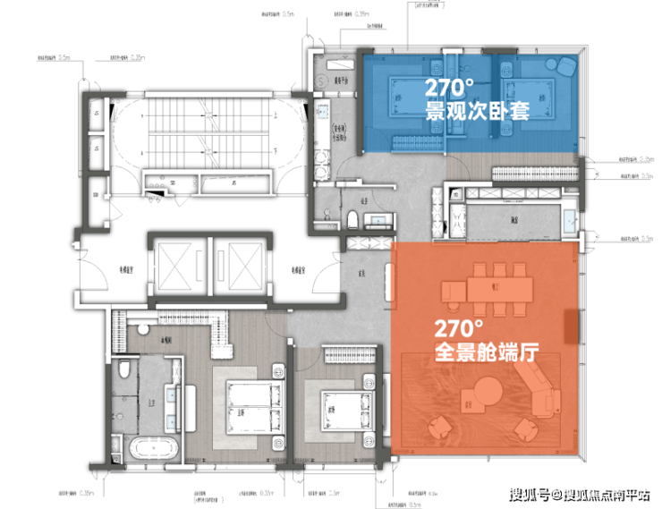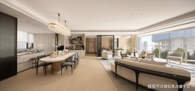 242㎡户型另一大亮点在于“双全景舱”设计——约75㎡的餐客厅与近50㎡的主卧套房,均采用270°全景幕墙设计,视野通透,尺度开阔。
