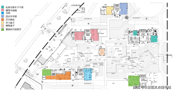 在地面层,各楼栋的架空层进行了系统的功能置入与动静分区,形成与地下会所互补的全时段生活场。