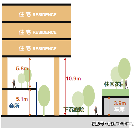 向下衔接会所与地库,向前贯通各楼栋的架空层,并有两处台阶和首层花园连接。