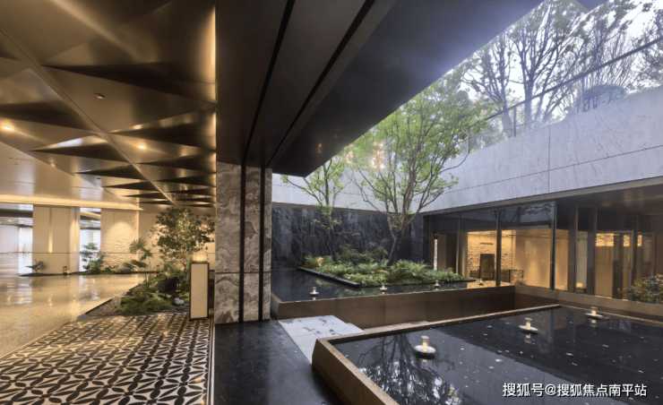 在242㎡楼王样板间里,最触动明源君的不是厚重的双开铸铝门,也不是高标准的电梯入户,而是推门即见的、位于户型中央的“悬浮式空中庭院”