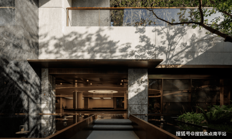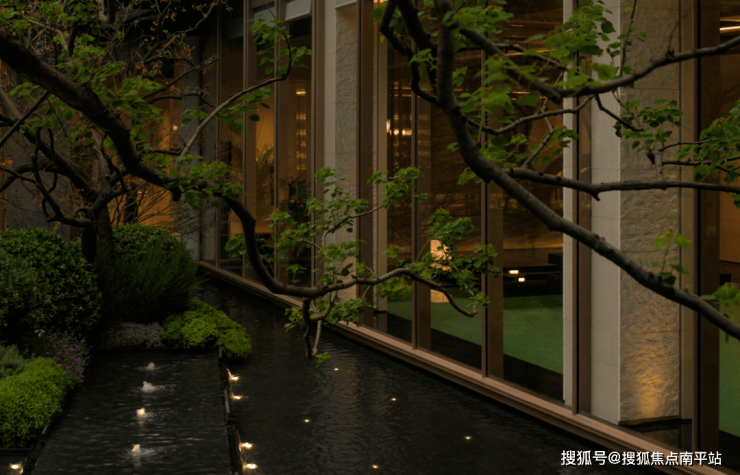 穿过大门,18米的叠水景观为引的庭院在眼前在展开——镜面水院倒映天光云影,两侧乌桕林与林下花境随四季变化不同画意。匠铺的砖石与雪山兰石材景墙,勾勒东方意境。