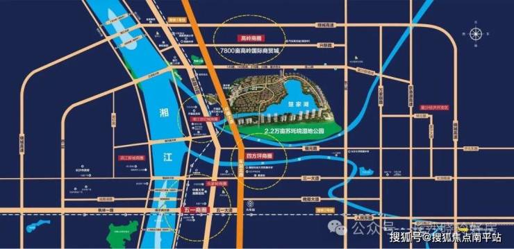 项目位于长沙市开福区车站北路延长线(开福大道)与北二环交汇处,属于长沙二环内城市区,同时也属于政府规划的苏垸生态新城区域,背靠2.2万亩苏托垸湿地公园,环绕楚家湖。