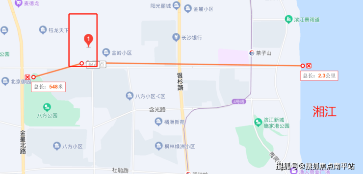 项目南侧500米有八方公园,往东2.3KM可达湘江