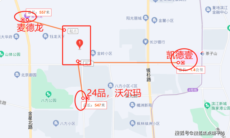 地块南侧茶子山路自建商业体,向南500多米有八方小区的24品,往西550米有河西麦德龙,沿茶子山路往东1.4KM到凯德壹中心