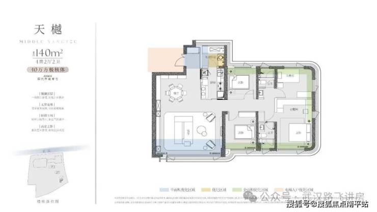 ②140㎡户型:四房两厅两卫,该户型南北通透、三开间朝南;因为3号楼的楼栋朝向、位置,属于北向看江,因此,这一户型的北面房间——次卧、儿童房拥有还不错的看江视野(中高楼层以上房源)。客厅空间相当的开阔,动静分区做的也比较好。