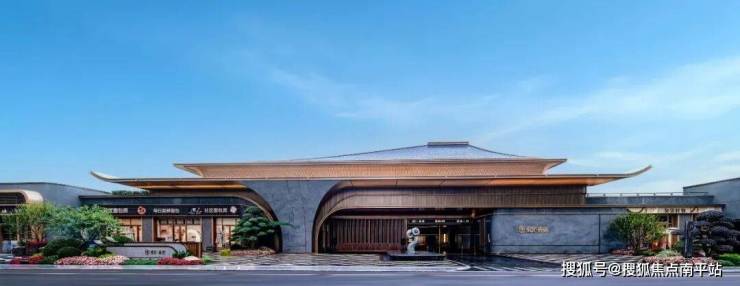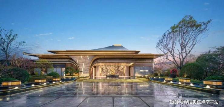 宽59米、高13.6米的千万级金属飞檐门,选用爱马仕灰石材及香槟金属格栅构筑,搭配前场的造型独特的名贵黑松、铜质太湖石的点缀,归家的仪式感拉满。