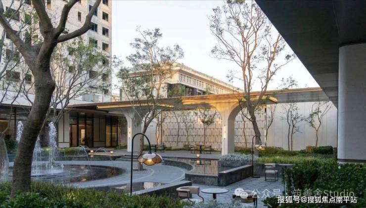 融合四颗精选朴树,旱喷广场打造出中心聚合的舒适空间,营造出轻松愉悦的生活烟火气息。