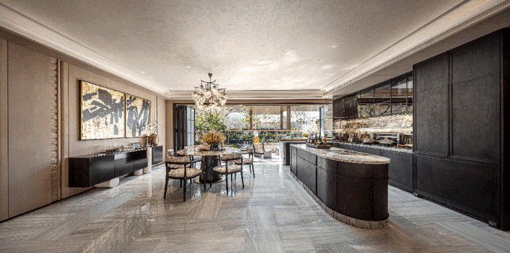 LDKG一体化阔厅无缝衔接约49㎡超尺度空中花园,堪称项目的灵魂所在,于此同步尽揽江景、城景、园景三重稀缺景观资源。它既是名流汇聚、家族盛宴的云端社交主场,亦是静思独处、观照世界的私属心灵领地。