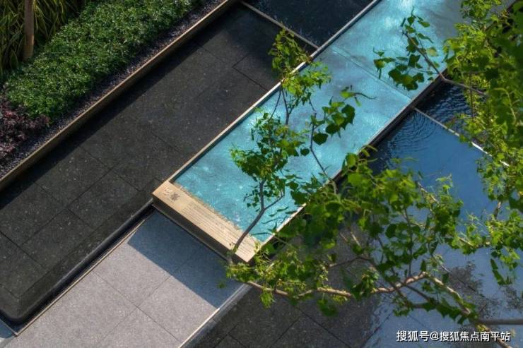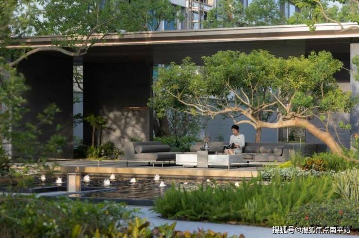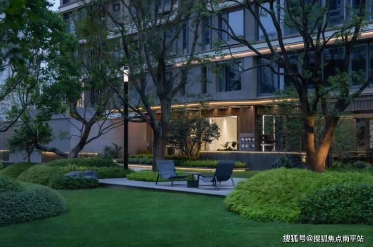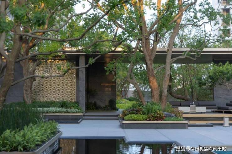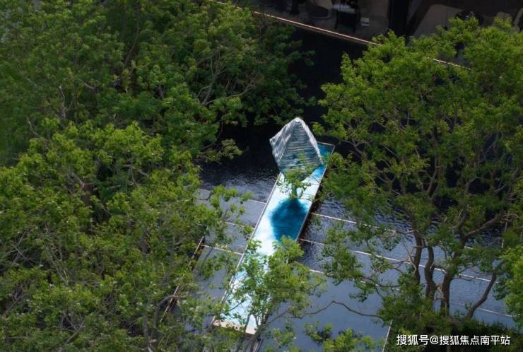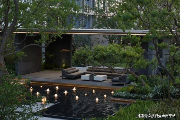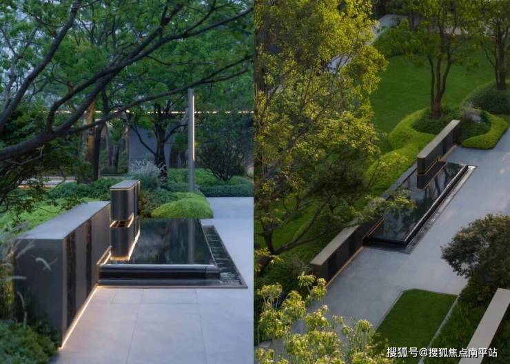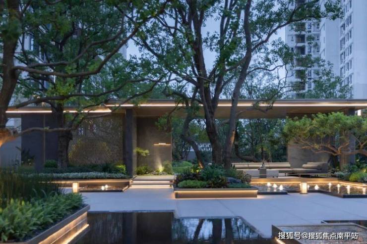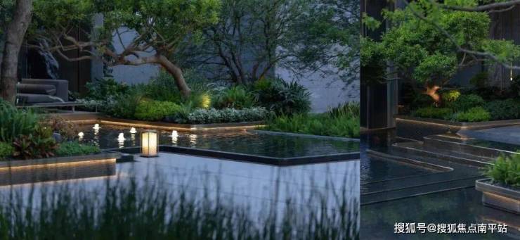 空间设计以绿植和艺术水景为基调,水景映射着周围灯光的温柔与树木的婀娜,水面荡漾着光影,与周围景色交相辉映,营造出一种如梦如幻的视觉效果,呈现出自然而温润的氛围画面,清雅安然,宁静怡心。