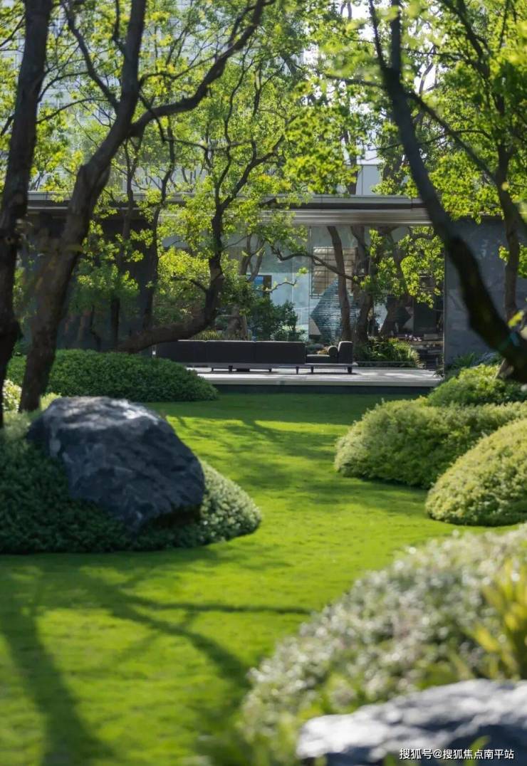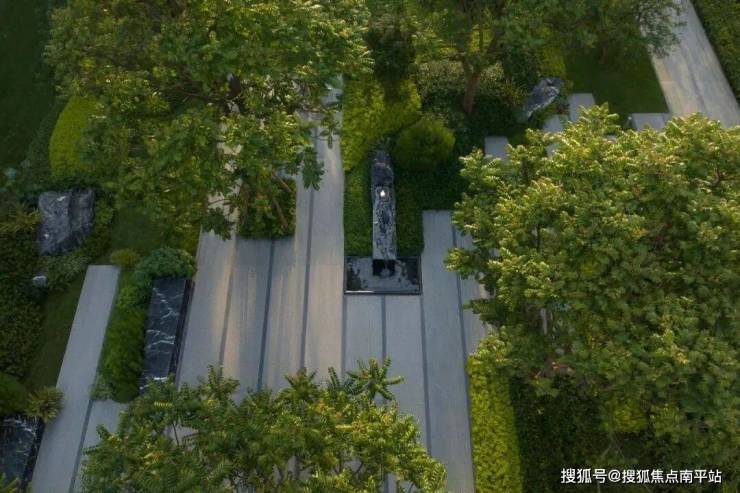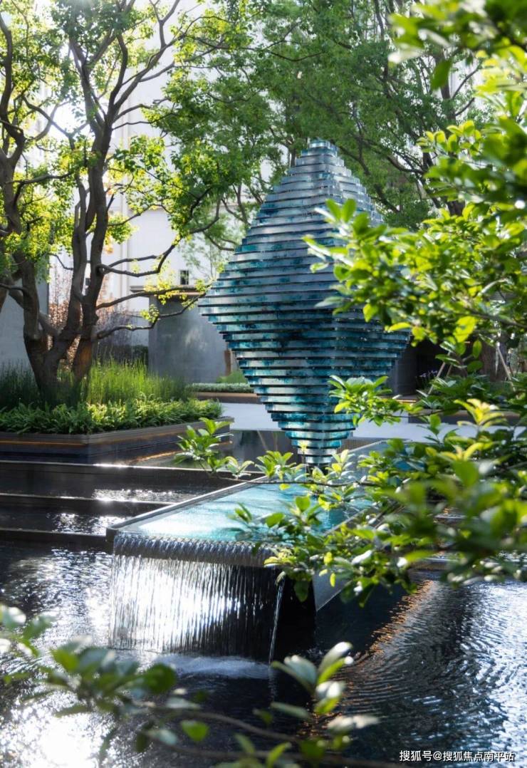 流畅的布局与干净的线条、在虚实之间完美结合。格调高级、大气且不乏典雅气质。利用场地高差关系做叠级,蓝色琉璃奢石与璀璨的雕塑结合,绿丛与水景衔接,在和煦的阳光下,整体的材质色彩搭配和谐、空间底色静雅,展现高雅品质。