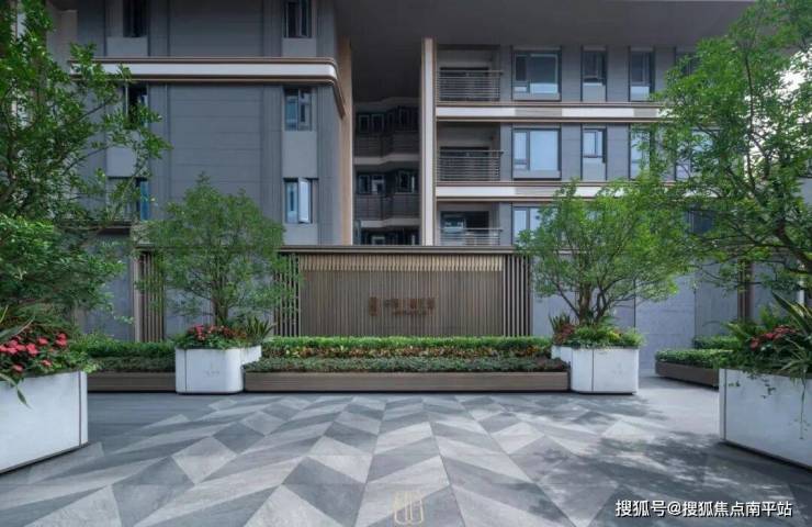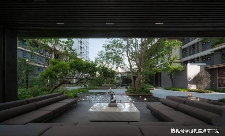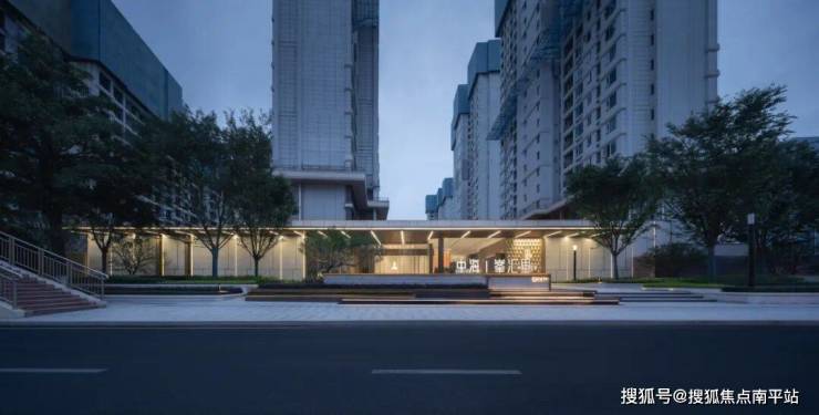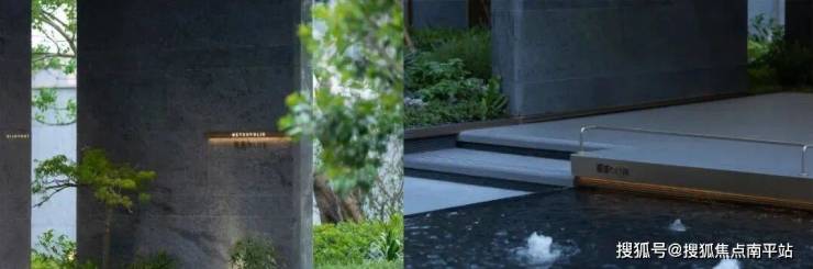 前场全冠移植榉树迎宾,景墙立面采用浪花白花岗岩精工拼贴,充满艺术感的水景与绿色地被体块,多种组合成独特而大气的入口界面印象。通过将细腻光泽的金属、若隐若现的灯光,纹理感极强的铺装、色彩奢雅的花岗岩,作为奢侈符号和精巧质感的外化,细节之处彰显品质,拉开美好人居序幕。