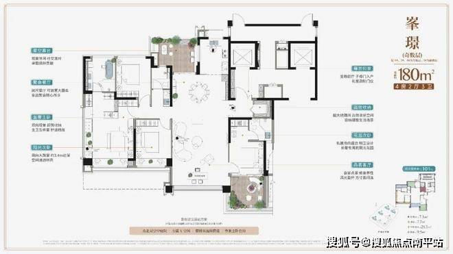 约21米的南向面宽、超100%的得房率、独立电梯厅与双开门设计,共同定义了平层的墅级体验。约5.8米横厅与独立茶室、中西双厨构成的社交主场,以及可轻松容纳多代同堂的五房三套卧格局,使其成为满足家族长远居住需求的理想居所。