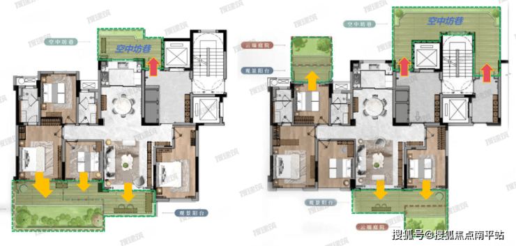 御都珑水雲墅项目最大亮点之一在于对产品户型的空间变革,在传统大平层的基础上,通过垂直绿化的空间形制、空中庭院产品形态,将只能存在于东方合院与现代别墅花园里的完善功能空间集中至同一平面,实现家家有庭院的前沿空间格局。