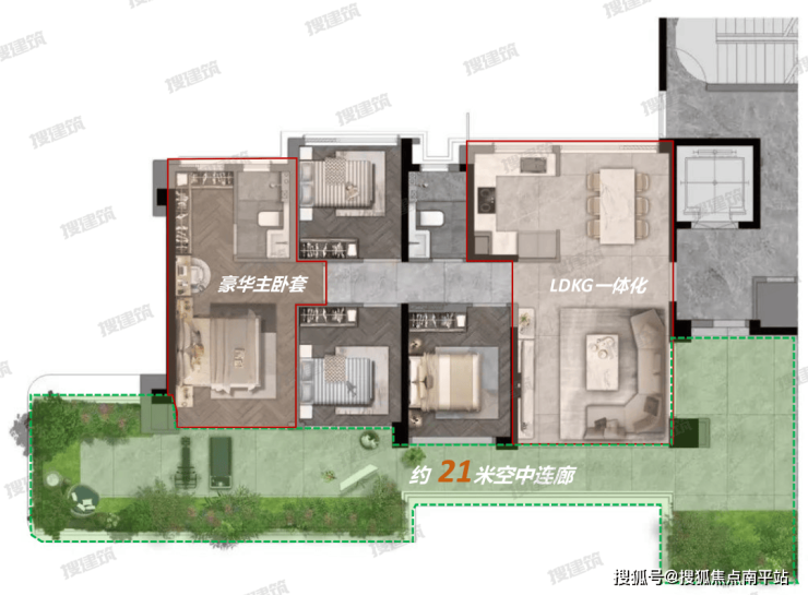 建面约148平的户型,在南面所有面宽均设置了空中花园,形成约21米长的空中连廊,可尽享270°环绕视野;屋内采用南北通透的LDK客餐厨一体化设计,和独立的衣帽间主卫体系,让生活起居张弛有度 。U型中厨之外,岛台式西厨空间,连接餐厅,双面采光,双面赏景。