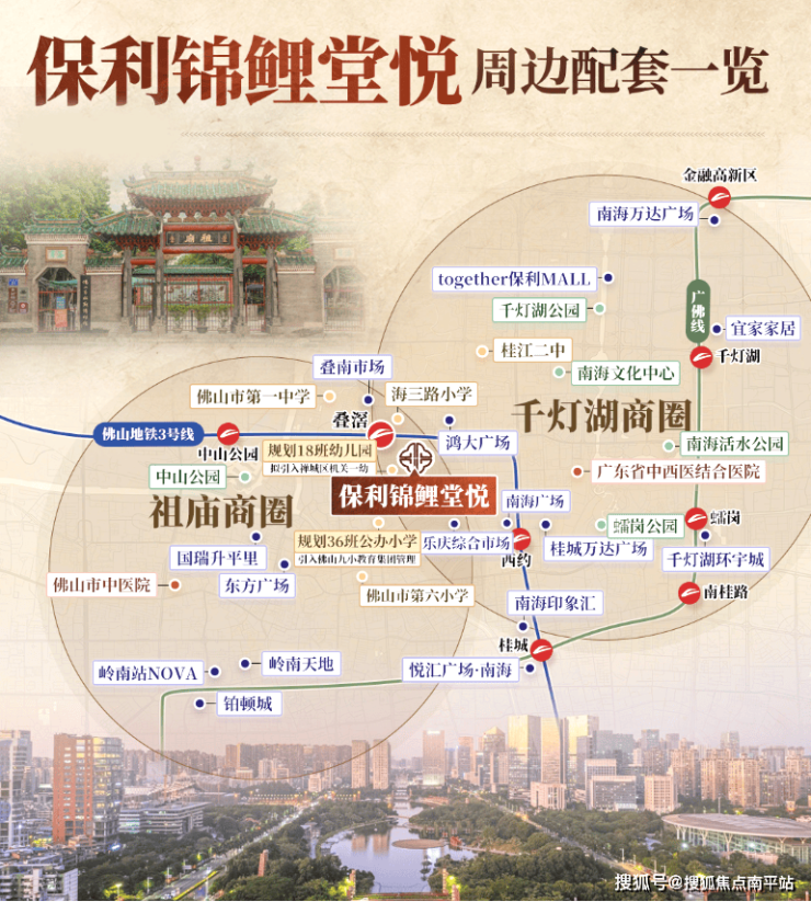 保利锦鲤堂悦落子禅桂交界核心,直线距离千灯湖约1.5公里,既能享受千灯湖金融商务区的资源辐射,又能坐拥祖庙老城区的烟火气。项目周边3公里范围内,东方广场、铂顿城、鸿大广场等商业体密集,步行可达的肉菜市场、药房、餐饮店满足日常所需,真正实现“下楼买菜,上楼看江”的便利生活。