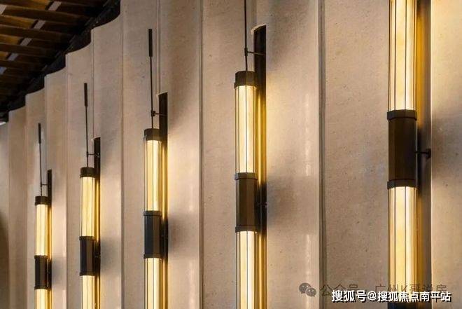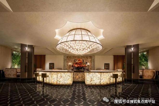 透过中空挂落,日光倾泻而入下方的“金石浮光”的艺术雕塑,阳光与金石肌理交织出细腻的纹理,低调奢华的氛围扑面而来。