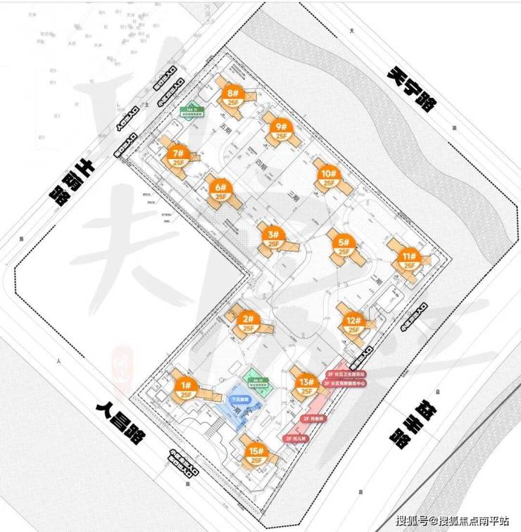 主入口设在人昌路一侧,小区内设下沉庭院、景观连廊、约1.6万㎡绿地空间包含两处体育健身场地。