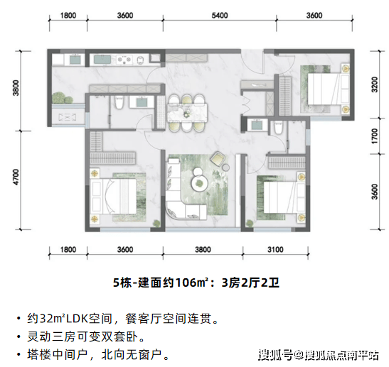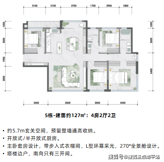 其中,首开的5#为两梯三户塔楼形式,户型106㎡(中间户)、127㎡(边户)。106㎡做到三室两卫,紧凑实用,适合刚需;127㎡四室布局,南北通透,得房率高达约107%,兼顾功能性与舒适度。