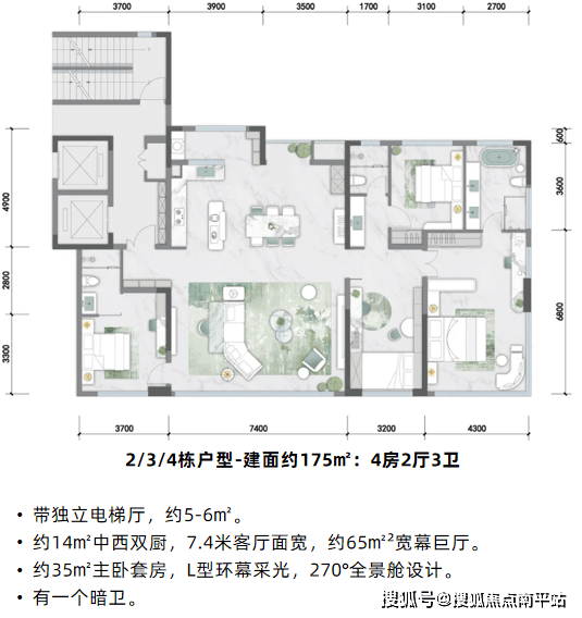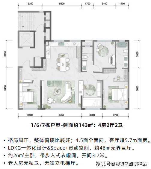 其余楼栋均为两梯两户纯板楼设计,143㎡主卧套间带独立卫浴+衣帽间,近零公摊,比肩传统178㎡户型可使用空间;175㎡户型带独立电梯厅,大横厅设计,搭配全景落地窗,得房率约104%。