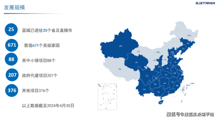 截至2024年4月30日,蓝城已进驻中国25个省及直辖市,营造671个美丽家园,其中小镇项目88个,政府代建项目207个,其他项目376个。2023年荣登代建规模第二、政府代建第三。
