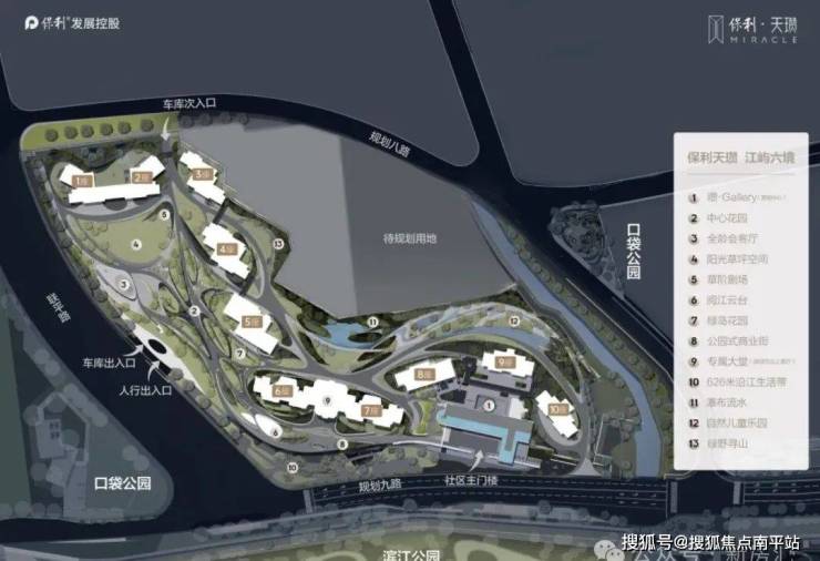 从地理位置来看,保利天瓒享有城市水脉的优越条件,紧邻滨江艺术水脉,面朝世界湾区南向一线江景资源。项目周边的艺术滨江公园全长约2公里,投资2亿人民币,分为艺术水岸、市民剧场和生态体验三大功能区,设有滨水步道、儿童乐园、滨水沙滩等18个活动场所,充分展现了滨水区域的景观与生态资源。