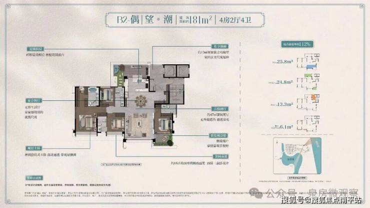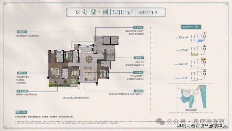 类独梯独户,享约13㎡独立观景电梯厅;约47㎡奢阔宽厅与宴会级餐厅相连,公区空间进一步扩大;约19米朝南面宽,四房三套卧且带四个全明卫生间设计,完美契合三代同堂或二孩家庭改善居住需求,其中酒店式套房主卧,不仅配备独立衣帽间+独立卫浴+观景飘窗等,还做到南北通透格局,居住舒适度高。