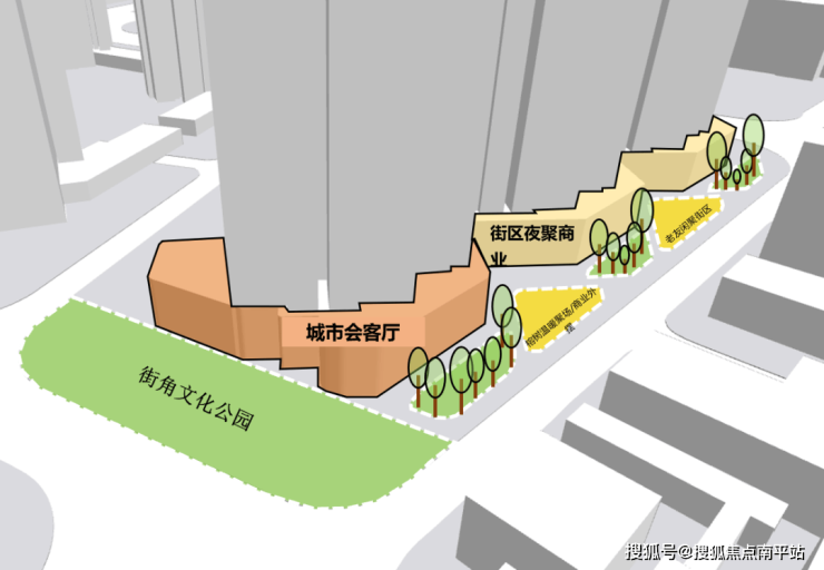 从流传出来的方案设计图,可以看到越秀采用了 城市会客厅+街角文化公园+榕树要素,将打造老友闲聚街区、榕树温暖聚场 等,确实很广府调调。