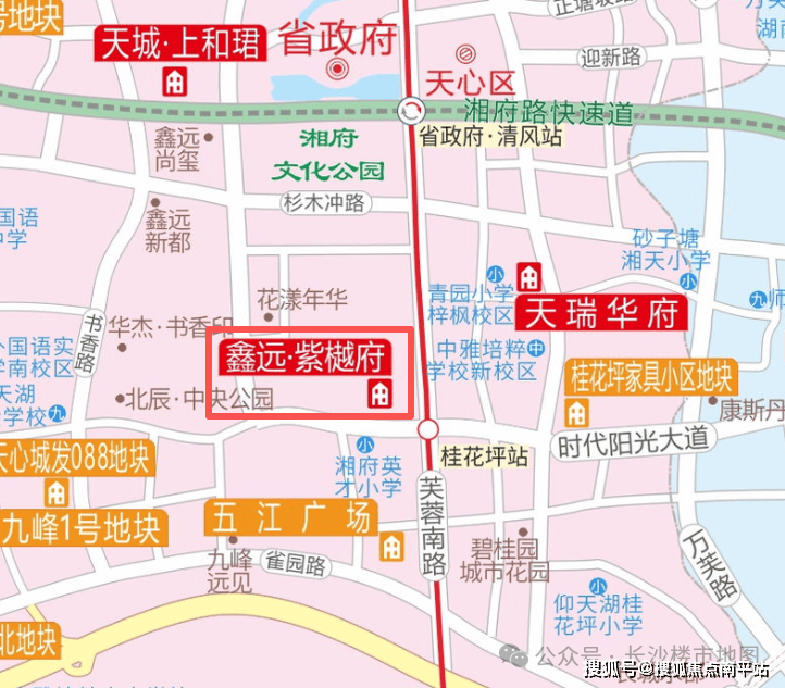 鑫远紫樾府离湖南省政府也就800米左右,妥妥的政务核心黄金地,还能享用到“三馆一中心”这些城市级文化配套,周边居住圈层也纯粹稳定。