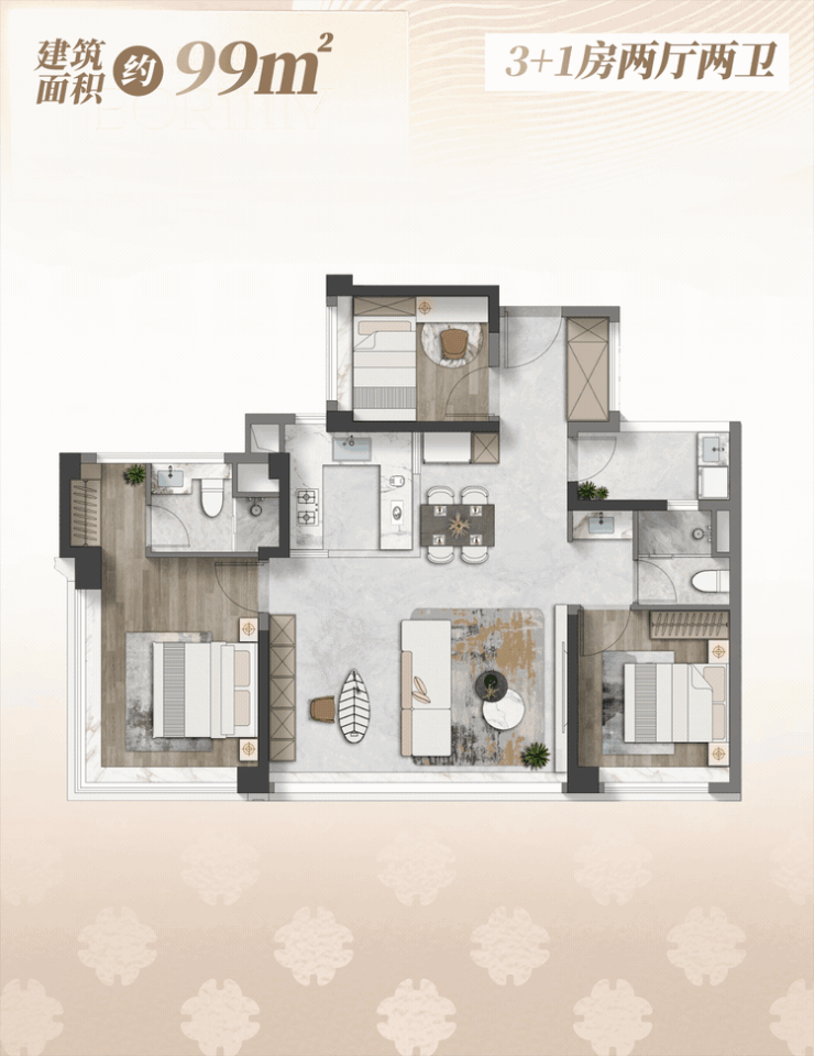 建筑面积约99㎡户型,可成长的3+1房