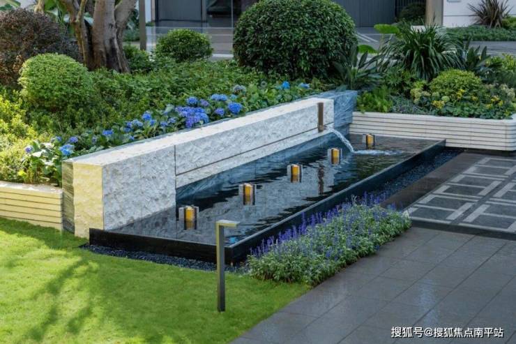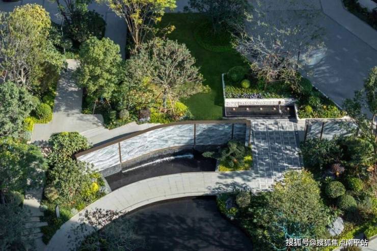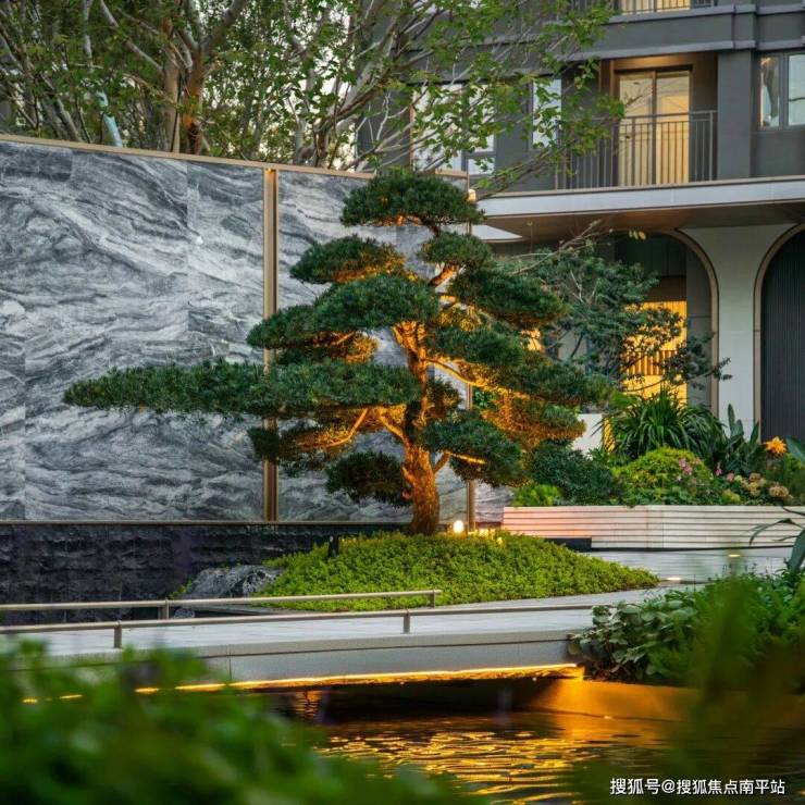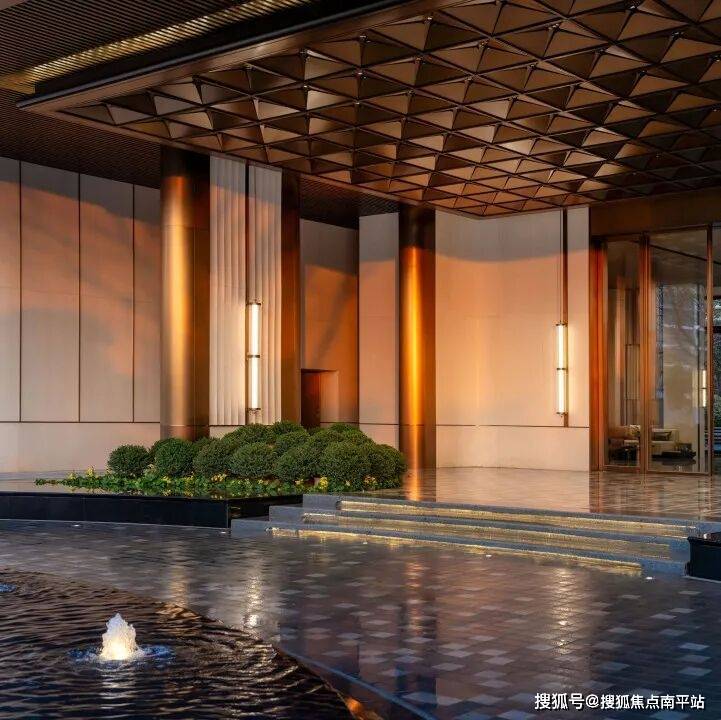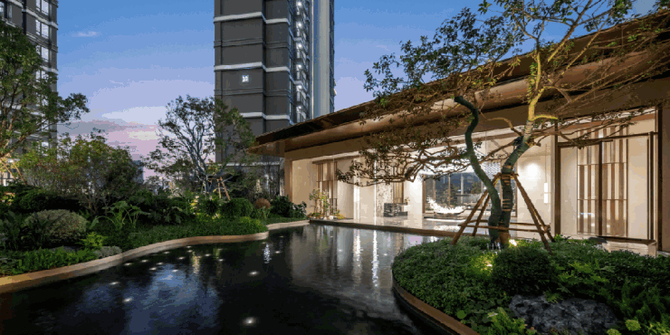 社区大堂,大面落地玻璃框住的主水景,水鸣波光,松染石痕,令人身心顿然沉浸。这种从城市喧嚣到社区静谧的过渡,处理得相当自然、高级。