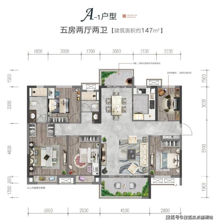 第三个户型为建面约147㎡改善型4+1五居室,5房2厅1厨2卫南北通透的奢阔户型,采用的是最为实用的竖厅设计。
