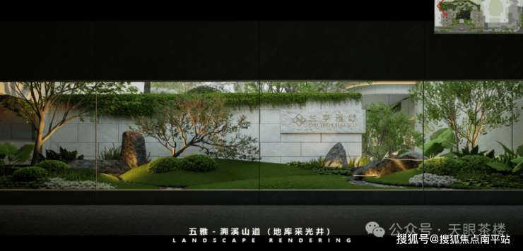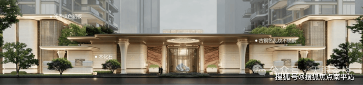 入口两侧的奢石采用竖向的错落肌理,提取了竹节的错缝特点,暗合《兰亭集序》中“茂林修竹”;木化石的木纹肌理,以自然古雅的纹理呼应文人雅致:既契合《兰亭集序》“林泉雅集”的自然意趣,细腻内敛的肌理又暗合文人审美中的含蓄格调;“木化入石”的质感,更隐喻文脉沉淀的学府气质,与学区房属性呼应,让立面材质自带兰亭雅颂的文人调性。同时,古铜色不锈钢材料的加入,进一步给“兰亭雅颂”注入学府气质,古铜色温润复古的色泽,低调而奢华,近似古籍装帧、文房铜器的质感,暗合学区的人文沉淀,门廊通透舒展,既匹配学区的人文氛围,又以精致细节锚定社区雅致调性,成为学府住区的标识性门面。