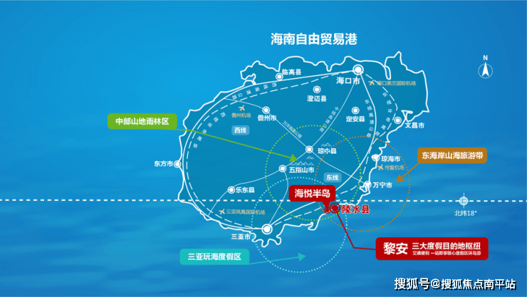昊瑞·海悦半岛项目位于海南陵水文黎大道与中心大道交汇处,距G98环岛高速黎安互通约5公里,距陵水动车站约7.7公里,距离三亚凤凰机场约71公里。从项目出发,开车约1小时到三亚市区,约2个半小时到海口市区;陵水站乘动车22分钟抵达三亚市区,75分钟可到海口市区,项目路网发达,海陆空畅连全岛、全国。
