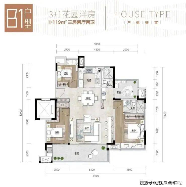 A户型:建筑面积约108㎡,3+1房2厅2卫。布局紧凑,南北通透;入户式玄关设计,保证户内隐私,户型方正,可变性强;客餐一体,空间开阔明朗;前后通透,双阳台设计,包揽别样美景;拖拉门明厨,双灶台设计;南向主卧,独立卫浴,带超大飘窗。