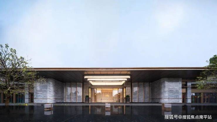社区入口打造约 66 米开阔尺度的大门,采用自然奢石打磨,建筑立面以极简现代风格为主,大面积玻璃搭配柔和金属线条,既提升建筑的美学质感,又最大化增加室内采光与视野,让建筑与城市、自然实现视觉融合。