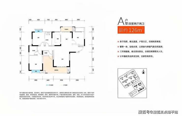 🔘 126㎡户型高配平层(3+1房2厅2卫)南北通透双阳台,客厅(4米开间)/主卧/次卧三开间朝南;南北双阳台、套内花园、双飘窗,可改造面积约12平米,约88%得房率;布局上动静分区,打造成二胎空间,大四房设计,男女主人、父母、小孩享私密空间