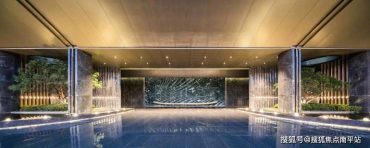 移步门庭,一幅犹如奔涌不息的江面的巨幅景墙映入眼帘,这其实是 液态大理石。