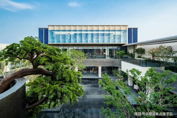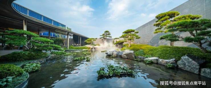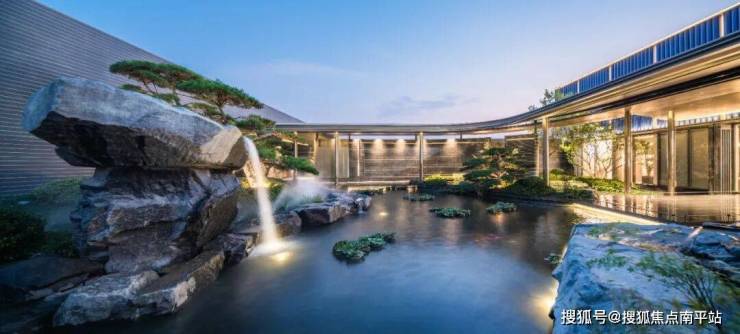 下沉庭院是与会所链接的重要区域,建筑立面采用船篷曲线的造型,迎合泛云舟的运河主题,作为依托,庭院中心打造了约210㎡的水系。