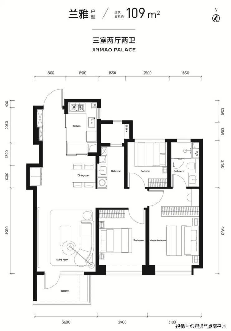 ▲天津金茂府建面约109㎡三室两厅两卫户型图