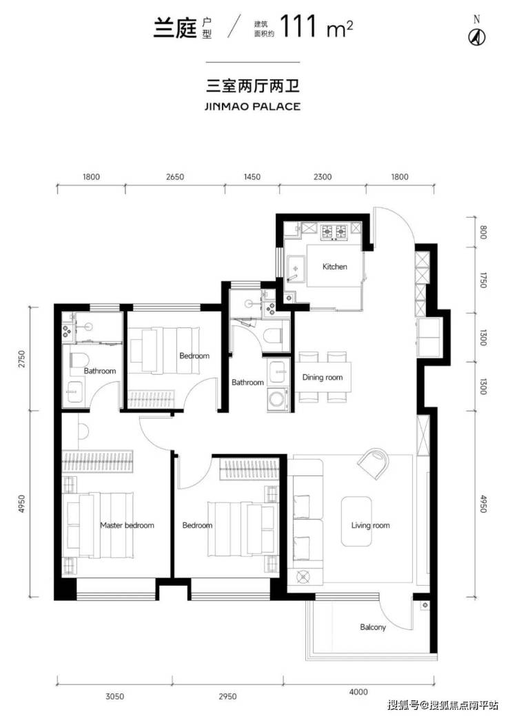 ▲天津金茂府建面约111㎡三室两厅两卫户型图