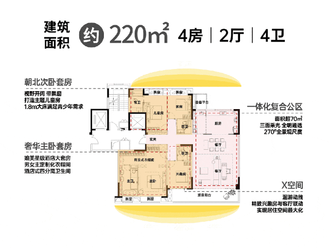 还有建面约220㎡颠覆认知的大平层,南向面宽扩展到近16米,双面玄关+墅级一体厅,全景四房、全套房化享受,这才是更彻底的改善、更超越的四房生活!