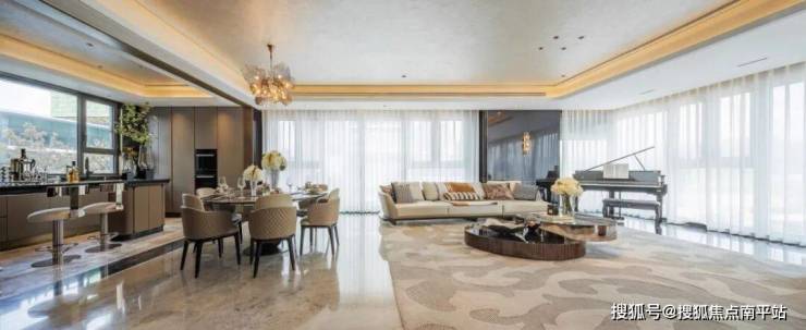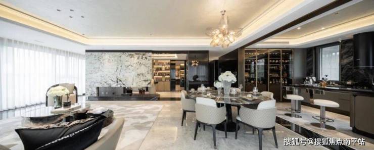 以独立电梯厅+双面玄关铺就门第威仪序章;超70㎡客、餐、厨、阳台一体厅,三面采光,270°瞰景双阳台,形成优越的“观景+生活”双配置;灵活变动的中西双厨+可互动的中枢型岛台,视线向外,是可容纳阖族欢聚的餐厅、奢阔客厅;