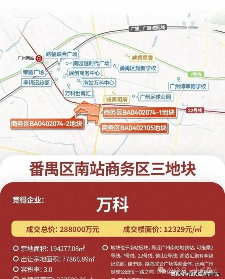 万科以底价28.8亿拿下广州南站商务区三宗宅地,总面积约23万㎡,折合楼面价约1.1-1.3万/㎡,铺开了南站3.0时代新的深度求索。