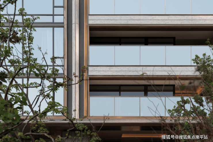 大门两侧镶嵌着匠人亲手烧制的天青色陶板,取意宋瓷美学的静逸底色,流转如湘水波光的质感肌理;陶板以犀利的斜切几何造型,勾勒门仪锋芒,隐喻长沙“敢为人先”的棱角与胆魄。